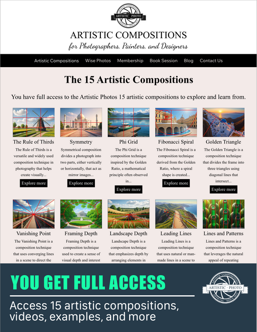 Full Access includes all 15 artistic compositions, with helpful guidance and expert advice, in-depth articles, explainer videos, photo gallery, storytelling with photography, and much more. You can explore the Rule of Thirds and the Symmetry artistic compositions for FREE!